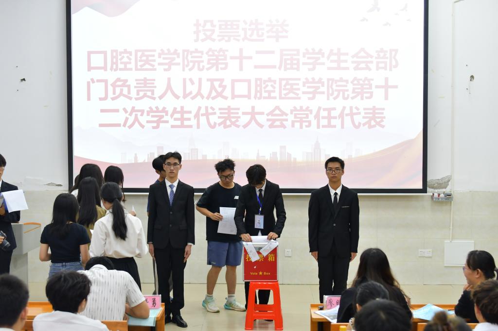 5月24日晚,口腔医学院第十二次学生代表大会在百东校区守正楼C207教室顺利召开。口腔医学院党委书记廖明华、党委副书记廖赞勇等领导嘉宾与各班学生代表齐聚一堂,共同见证学生会换届盛事。