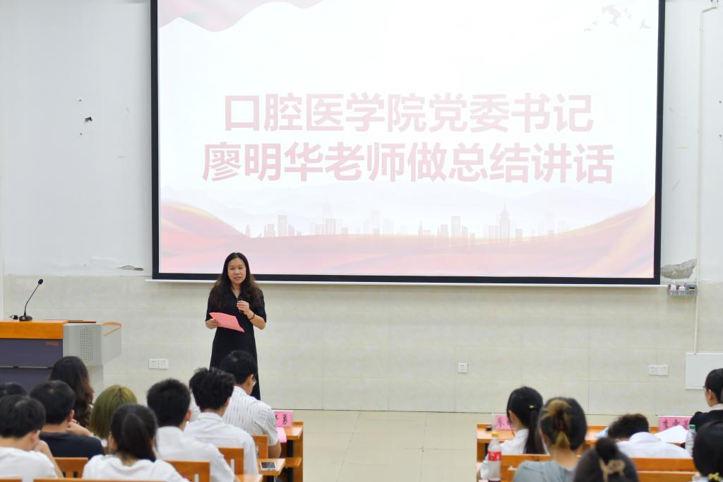 廖明华在总结讲话中号召青年们将个人理想融入国家医疗事业,以先辈精神推动口腔医学发展、守护民众健康,同时期望学生践行“大医精诚”校训,积极服务同学、助力学院建设。