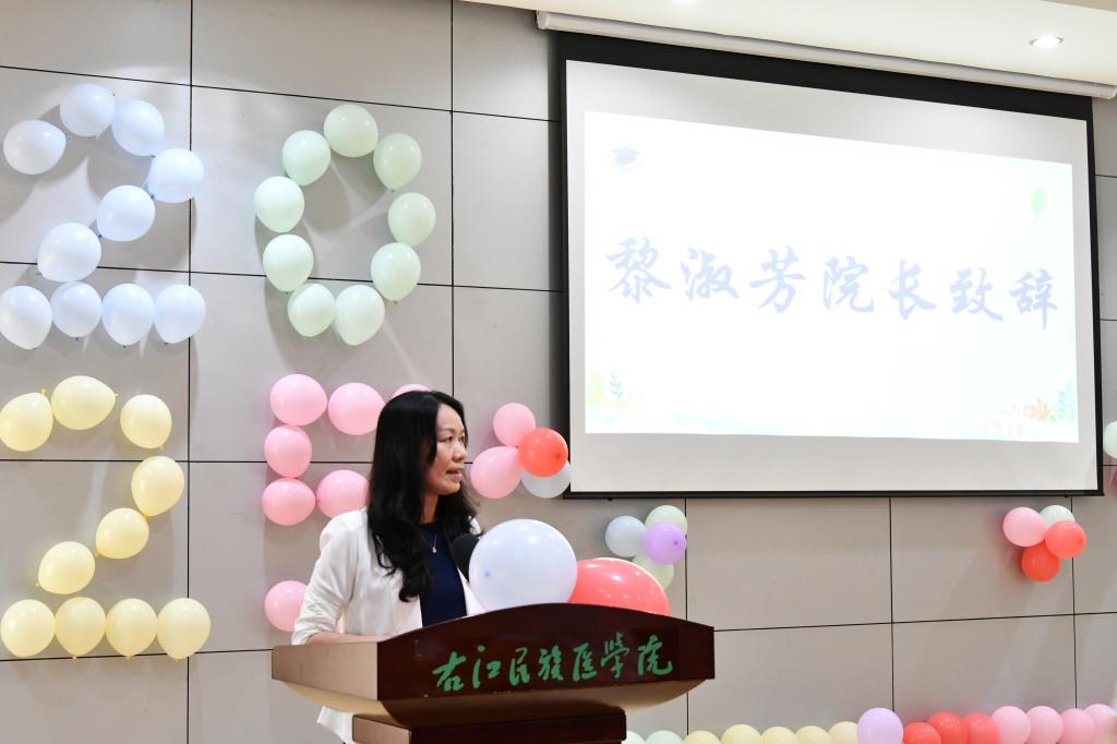 黎淑芳在致辞中希望毕业生们要牢记“大医精诚”校训,发扬“艰苦创业、自强不息”的右医精神,勇担时代使命,持续学习,在专业领域中精益求精,在未来的口腔医学道路上,以匠心守初心,用仁爱之温暖每一位患者。