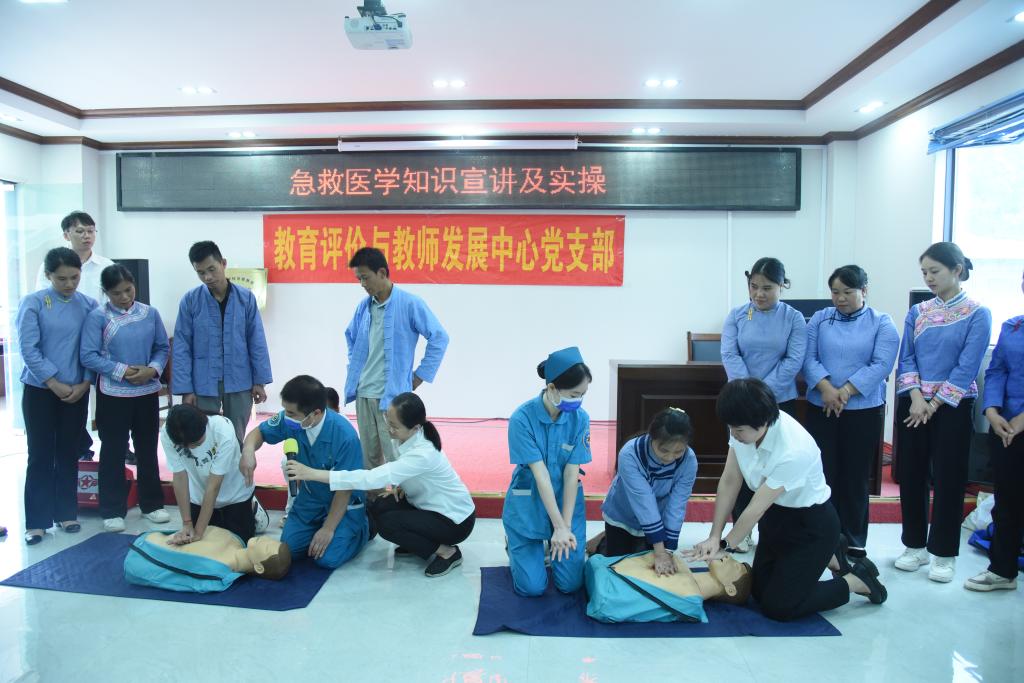 在百坭村村委会,附属医院急诊科唐霏副护长为约30名村干及群众开展急救医学知识宣讲与实操教学,讲解心肺复苏、海姆立克急救法等技能,指导现场实操。