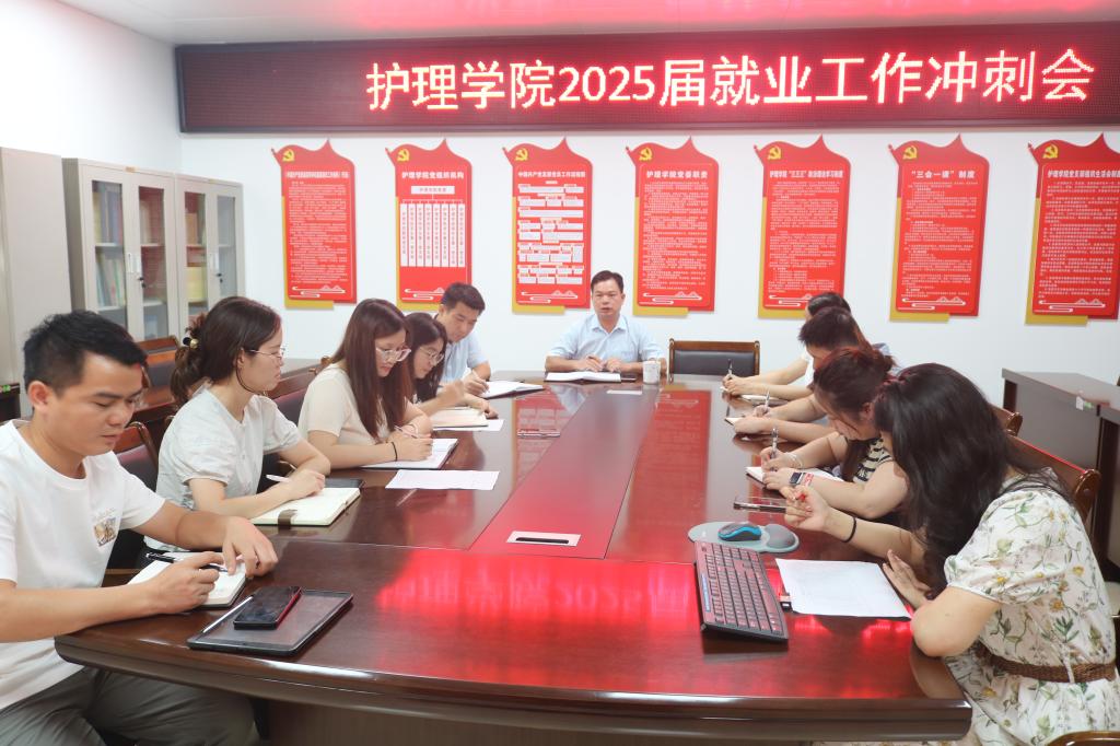 为全力推动 2025 届毕业生实现高质量就业,7月7日上午,护理学院在学院三楼党员活动室召开了2025届毕业生就业工作冲刺会议。本次会议由护理学院党委书记黄上峰主持,护理学院党委副书记邱勇强和全体毕业班辅导员、班主任参加此次会议。