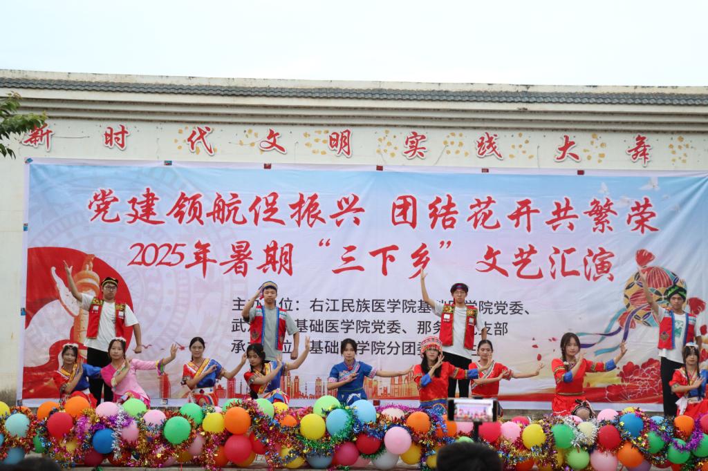 当夜幕缓缓笼罩那务村,一场 “党建领航促振兴·团结花开共繁荣” 主题文艺晚会,成为点亮乡村夜的璀璨灯火。实践团成员与村民们携手登台,柔美舞蹈蹁跹,把民族风情轻轻诉说;悠扬歌声流淌,传递着对家乡、对祖国的炽热深情;舞台上下目光交汇、掌声相和,共同编织出一幅民族团结的动人画卷。
