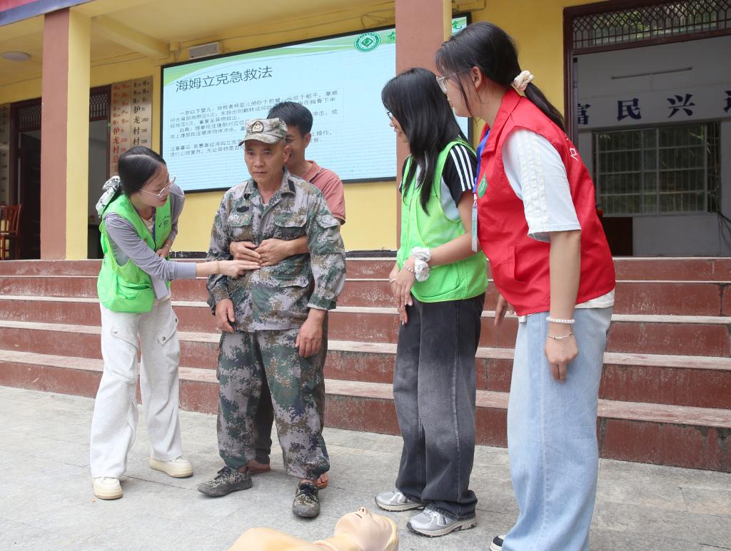 “大叔大妈们,今天我们来教大家一些日常急救知识,关键时刻能救命哦!”队员唐石晗伊用通俗易懂的语言和生动的示范,向村民们普及了心肺复苏、海姆立克急救法及基础包扎知识。村民们听得津津有味,不时点头表示理解,并积极参与互动练习。