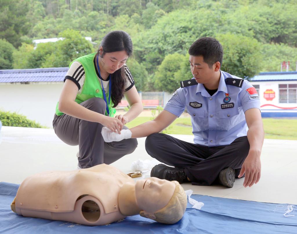 服务团在靖西市吞盘边境派出所开展急救技能培训。