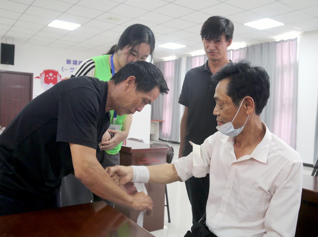 服务团成员在靖西市康城社区教授居民学习包扎方法。