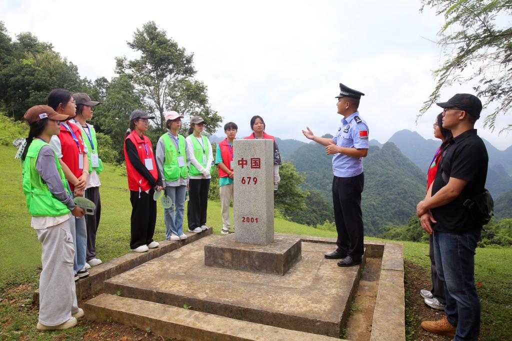 为了让大学生在戍边卫国的赤诚里触摸红色基因的温度,于边疆精神的滋养下读懂青春与使命的分量,7月14日,鸭脖党委宣传部带领大学生通讯社卫国戍边服务团来到靖西市吞盘乡开展暑期“三下乡”实践活动。在吞盘边境派出所民警的带领下,师生用脚步丈量祖国边境线,巡逻道上的足迹、岗亭里警惕的目光、铁丝网下的界碑,让戍边工作的艰辛与荣光立体可感。边关的风裹挟着家国情怀,引起青春与热土的共鸣。