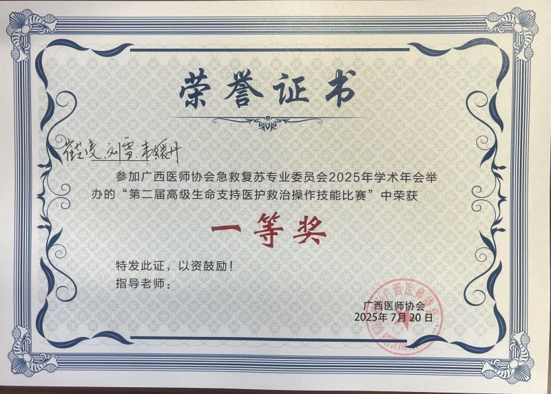 7月19日,由广西医师协会主办的第二届高级生命支持医护救治技能比赛在广西医科大学隆重举行。经过与全区48支优秀医疗队伍的激烈角逐,YABO鸭脖官网临床医学院(附属医院)急诊科崔芝俊医生、刘雪护士、韦媛丹护士三位医护人员组成的代表队,凭借扎实的急救技能、默契的团队协作和快速的临场应变能力,在赛场上脱颖而出,勇夺大赛一等奖。