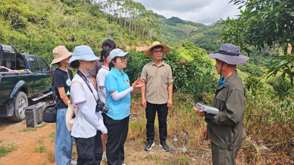 产业调研赋新能,科技助农促发展。者么村山茶油产业是当地乡村振兴的重要支柱。实践团深入油茶产业示范基地开展专题调研,在种植大户廖伯伯的带领下,实地考察油茶种植区,详细了解油茶生长周期和管护技术要点。通过徒步上山查看油茶树生长状况,观摩大型无人机智能浇灌作业,队员们深刻感受到现代农业科技的魅力。队员们还创新设计“油茶小精灵”品牌IP形象,为特色农产品推广注入新活力,更为后续助力产业振兴提供了扎实的实践依据。