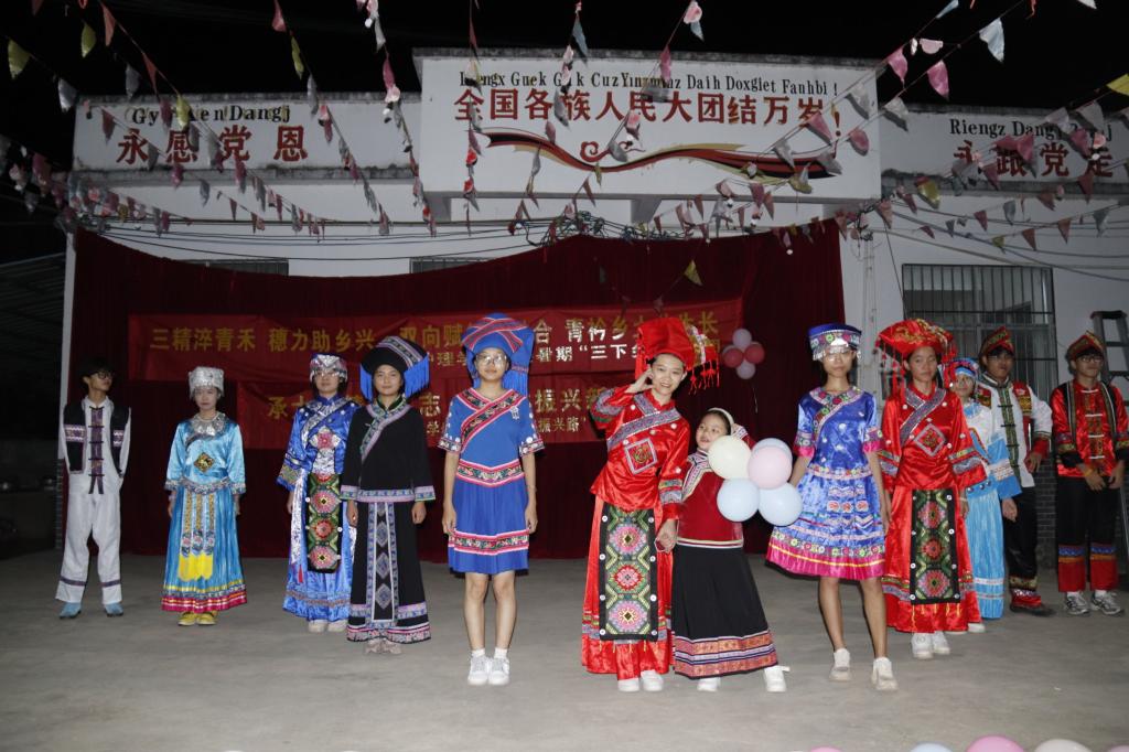 文化传承润童心,民族团结谱新篇。文化传承是乡村振兴的灵魂工程,实践团开设“非遗小课堂”,耐心带领当地儿童制作壮族麽乜与香囊,深入浅出地讲解传统手工艺背后的深厚文化内涵;精心组织“七彩假期”活动,以创意绘画、安全教育、科学实验等丰富多样的形式,充分激发儿童的学习兴趣。此外,队员们还与村民携手联办民族团结文艺晚会,民族歌舞活力四射、急救情景剧引人入胜,各类节目轮番上演,现场欢声笑语不断,气氛热烈非凡。这些活动不仅让传统文化在孩子们心中生根发芽,更架起了民族团结的桥梁,为乡村振兴注入深厚文化活力。