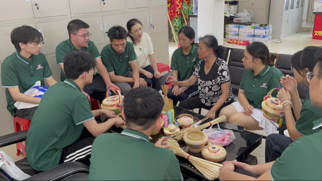 实践团队倾听非遗传承人讲解德保麦秆花篮制作技艺
