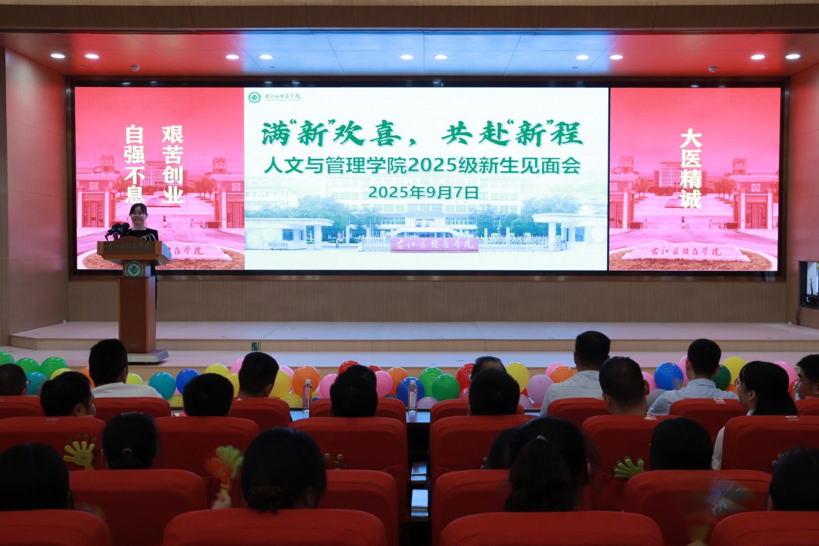 9月7日晚,人文与管理学院在国际会议中心学术报告厅召开2025级新生见面会。人文与管理学院党委书记、院长李常应,党委副书记、纪委书记陶肖云,党委委员、副院长农圣出席见面会,各科室负责人,教师团队、教研室主任代表和2025级全体新生参加见面会,龙能政、毛昌权、麻霄汉三位校友代表莅临现场。见面会由陶肖云副书记主持。