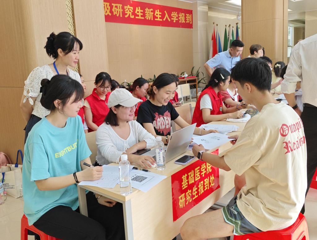 9月6日,基础医学院率先迎来了2025级研究生新生。学院党委书记宾晓芸深入迎新现场指导工作。迎新团队各司其职、配合默契,从新生报到登记到资料领取,每个环节都秩序井然。现场的老师与同学们热情洋溢,与新生亲切交流,耐心解答他们关于课程学习、科研方向、校园生活等方面的疑问。