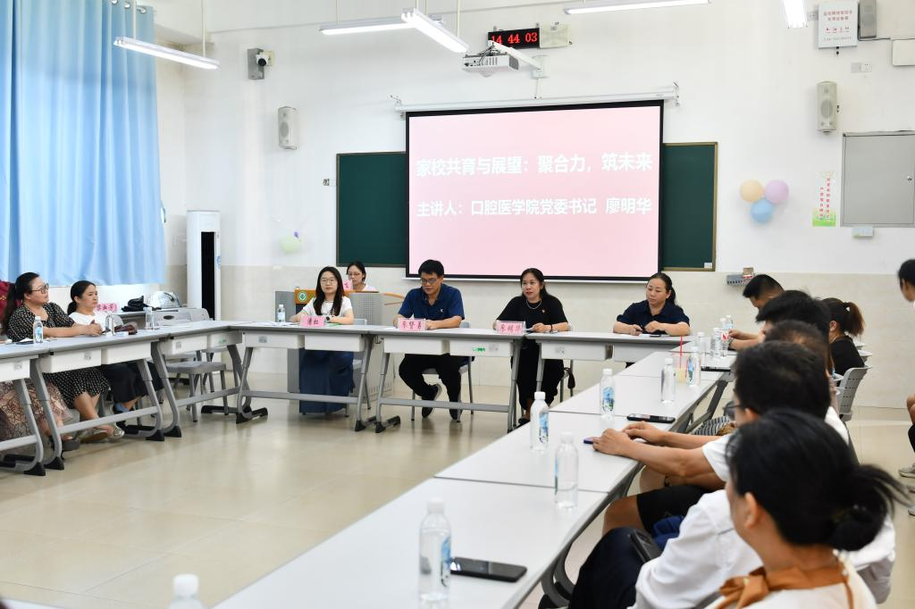 当天下午,学院组织召开新生家长见面会。会上,党委书记廖明华详细介绍了学院的发展历程与办学特色,她指出,学院将坚持“以党建引领学风,以党建推动管理”的育人方针,致力于培养有理想、有担当的卓越口腔医学人才。党委副书记廖赞勇就学生的成长与学风保障进行了介绍说明,副院长马卓飞向家长们解读了口腔医学人才培养方案。家长们凝神聆听、认真记录,不时与学院领导及老师交流探讨。