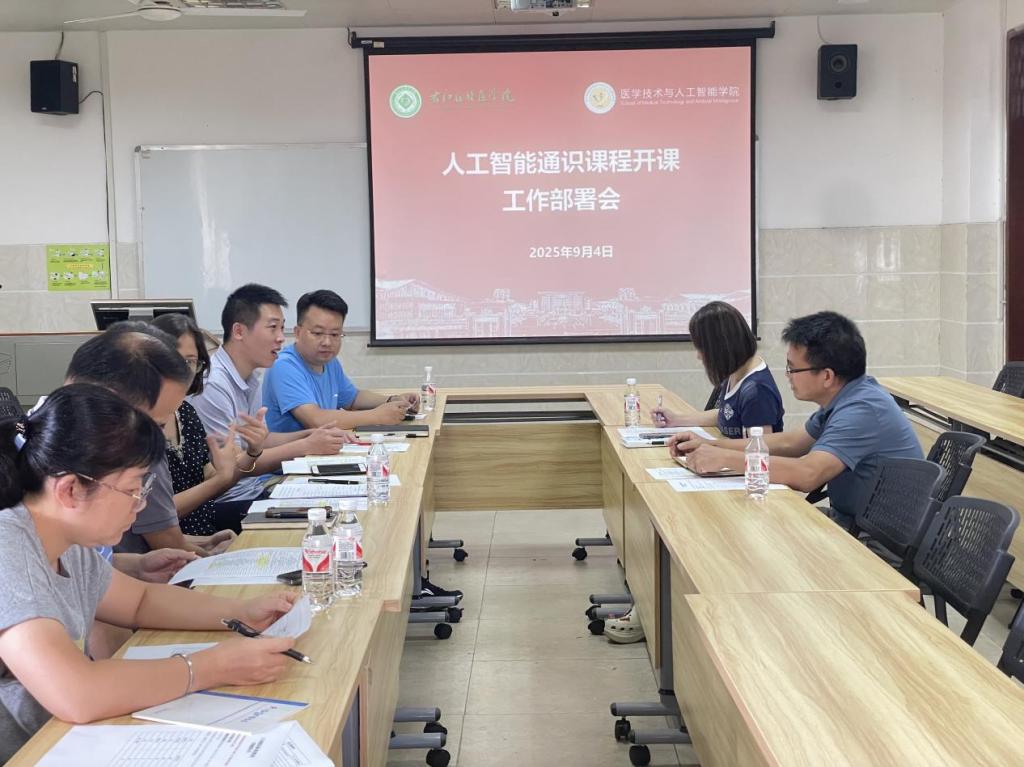 9月4日上午,医学技术与人工智能学院在学院会议室召开人工智能通识课程开课工作部署会议,旨在深入贯彻落实国家关于人工智能发展的战略部署,积极响应新时代对复合型人才的培养需求,全面推动人工智能通识教育在我校的普及与深化。学校教务处负责人,学院领导、课程组教师及相关部门工作人员参加会议。