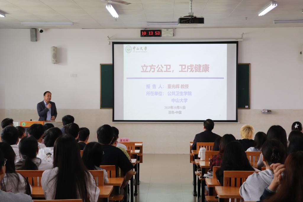 10月31日上午,中山大学公共卫生学院副院长董光辉教授应邀到鸭脖,于百东校区守正楼A105教室开展《立方公卫,卫戍健康:预防医学的科研使命与时代担当》专题学术讲座。校党委常委、副校长谭盛葵出席讲座,公共卫生学院党委副书记、纪委书记卢小新主持,学院全体教师及24级预防医学专业学生参会。