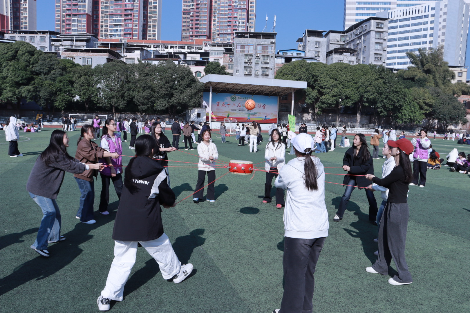 同学们齐心协力一同“击鼓”