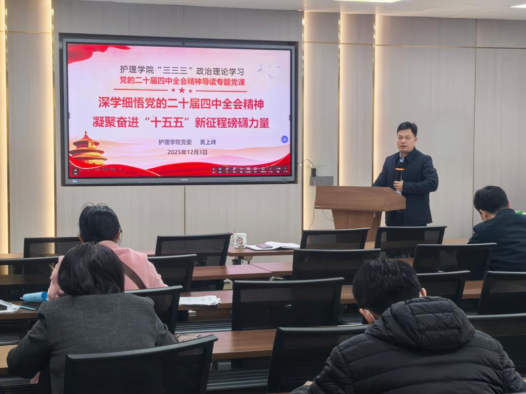12月3日,护理学院党委在百城校区八号综合楼二楼多媒体教室开展党的二十届四中全会精神导读专题党课,本次党课由护理学院党委书记主讲,学院全体教职员工参加学习。