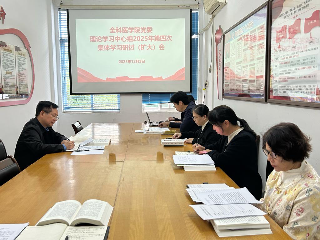 12月3日上午,全科医学院党委理论学习中心组在学院党员活动室召开2025年第四次集体学习研讨(扩大)会。会议围绕“深学细悟党的二十届四中全会精神与《习近平谈治国理政》第五卷——聚焦‘一体推进教育科技人才发展’战略部署,强化立德树人使命担当”这一主题展开。学校党委书记李雪斌到会指导,学院党政领导、党委委员、教师党员代表参加会议。