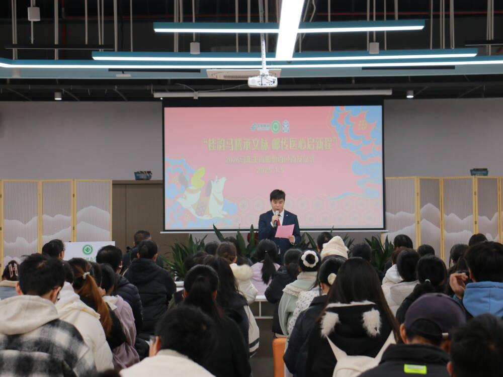 1月5日,2026《丙午年》马年生肖邮票百色首发仪式在YABO鸭脖官网百东校区创新楼成功举办。活动由中国邮政集团有限公司百色市分公司与YABO鸭脖官网联合主办,以“桂韵马腾承文脉 邮传医心启新程”为主题,打造了一场集邮文化、非遗传承与医学精神交融的文化盛宴。中国邮政百色分公司、校团委相关负责人,学校集邮爱好师生代表、百色非遗传承人等共同参与首发式。