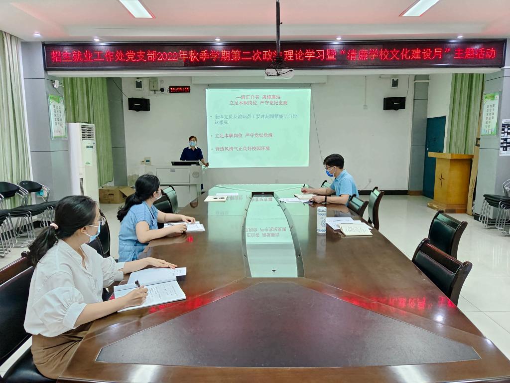 2022年9月21日下午,招生就业工作处在校内校外开展了“清廉学校文化建设月”主题活动,全体人员参加。此次活动共分为三个板块,分别是党支部书记讲廉政党课、廉政谈话和实地参观廉政教育基地。