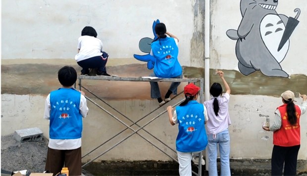 服务队成员与村委会工作人员共同绘制党建宣传墙
