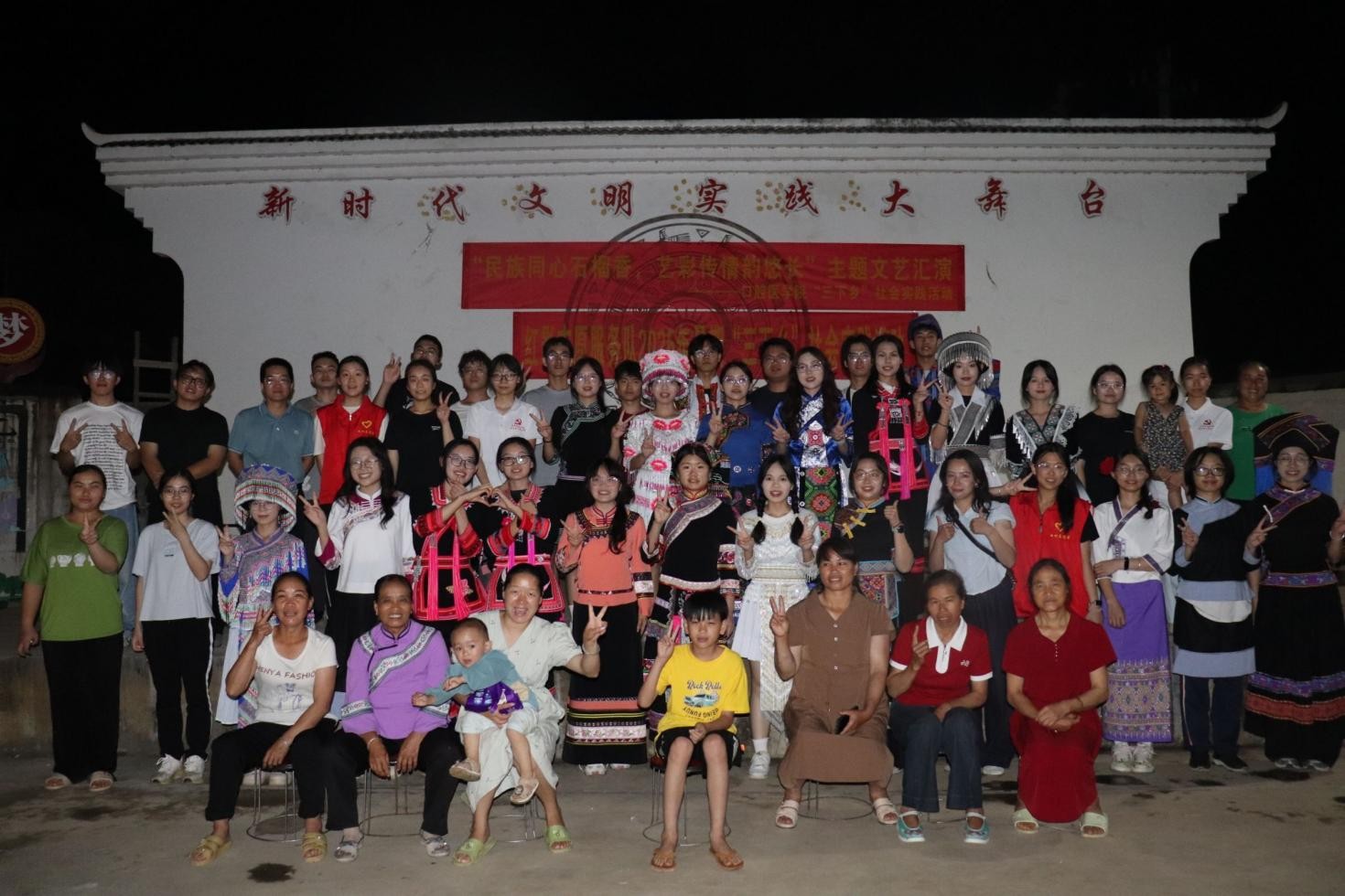 服务队携手村民举办文艺汇演,村民的芦笙演奏悠扬古朴,队员的集体舞活力四射,民族服饰走秀传递民族之美,整场晚会节目精彩纷呈。晚会尾声全场合唱《我和我的祖国》,激发炽热爱国情怀,激荡血脉相连共鸣。活动以文化为纽带,铸牢中华民族共同体意识。