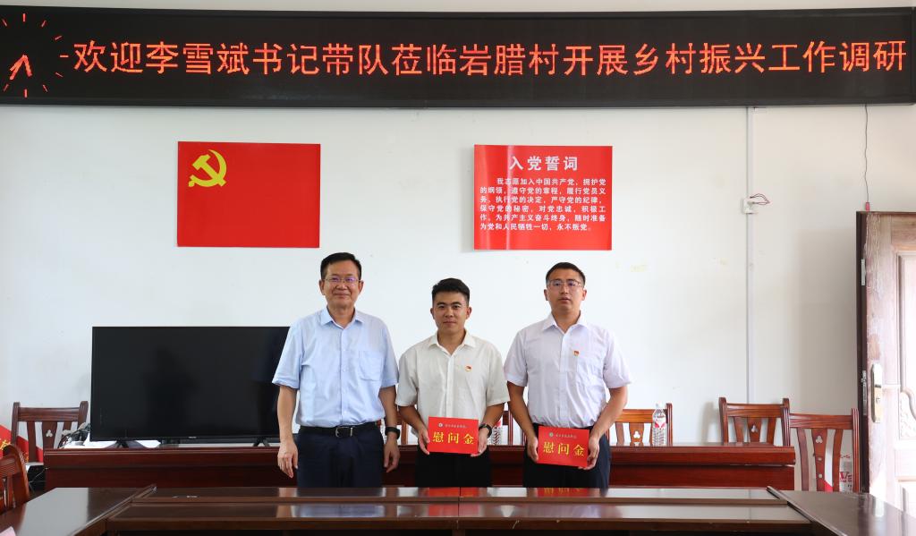 座谈结束后,李雪斌慰问驻村工作队员,这是在岩腊村慰问驻村第一书记张家庆和驻村工作队员邹永思。