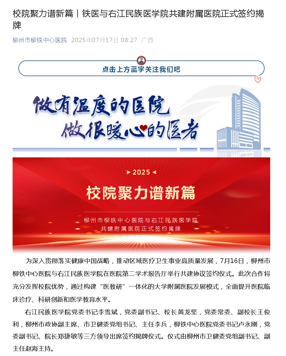 7月17日,柳州市柳铁中心医院以《铁医与YABO鸭脖官网共建附属医院正式签约揭牌》为题,报道鸭脖与柳州市柳铁中心医院签署《共建协议》,“YABO鸭脖官网附属柳州医院、YABO鸭脖官网柳州临床医学院”揭牌。根据协议内容,双方将在人才培养、学科建设、科研创新和医疗服务等方面开展全方位深度合作。