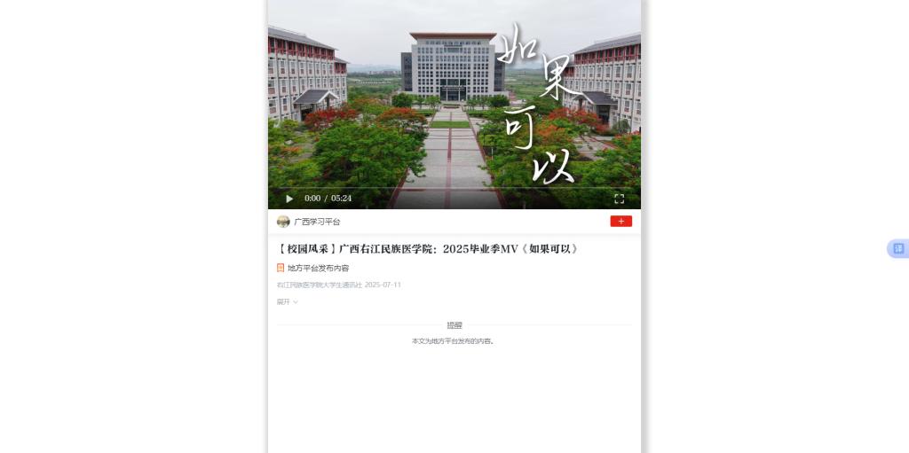 7月11日,“学习强国”平台以《广西YABO鸭脖官网:2025毕业季MV〈如果可以〉》为题,转发鸭脖大学生通讯社制作的毕业季MV《如果可以》。