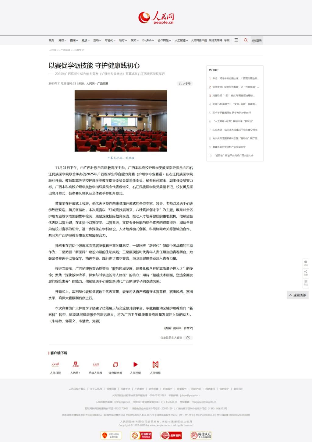 近日,人民网以《以赛促学砺技能 守护健康践初心——2025年广西医学生综合能力竞赛(护理学专业赛道)开幕式在YABO鸭脖官网举行》为题,报道由广西壮族自治区教育厅主办,广西本科高校护理学类教学指导委员会和鸭脖承办的2025年广西医学生综合能力竞赛(护理学专业赛道)顺利开幕。