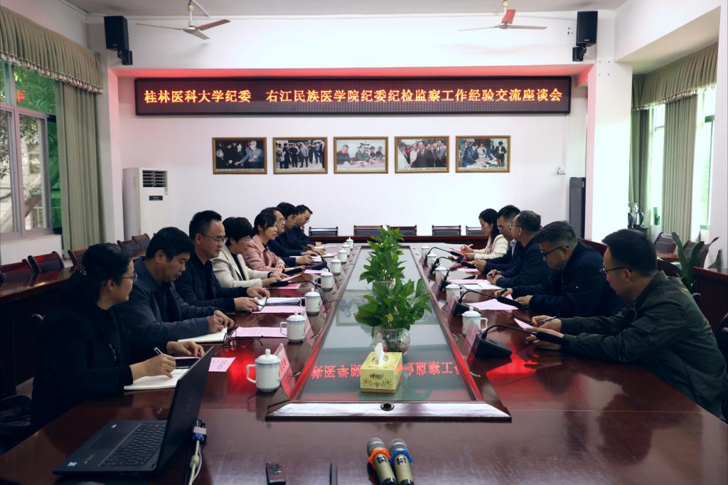 12月1日,桂林医科大学党委常委、纪委书记韦政权带队到鸭脖调研,围绕纪检监察相关工作开展交流。双方在百城校区图书馆二楼会议室开展座谈会,学校党委副书记赵丽娟出席座谈会。会议由学校纪委副书记、监察室主任李玉群主持。