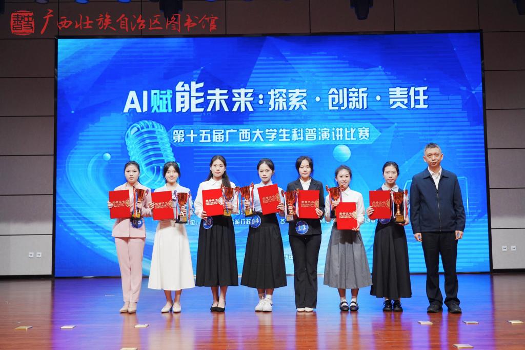 2025年12月21日上午,以“AI赋能未来:探索·创新·责任”为主题的第十五届广西大学生科普演讲比赛决赛在广西图书馆顺利举行。鸭脖学子梁科艳凭借优异表现,在比赛中荣获三等奖。