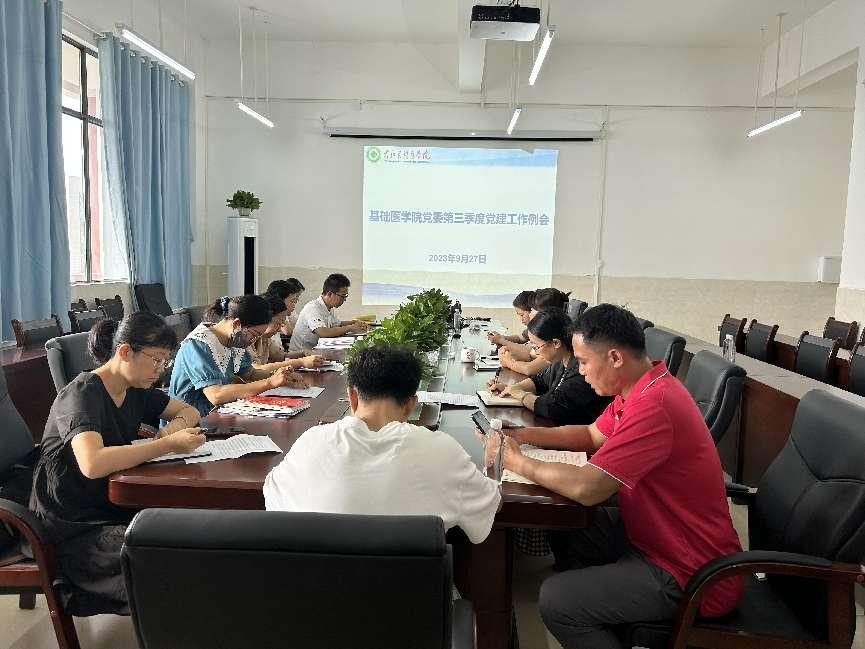 9月27日上午,基础医学院党委在百东校区创新楼B401会议室召开2023年第三季度党建工作例会暨上半年党支部述职考评会,总结上半年党建工作情况及经验,持续巩固深化学习贯彻习近平新时代中国特色社会主义思想主题教育成果,扎实推进党的组织建设。学院宾晓芸书记、卢荣妹副书记、组织员、各党支部书记参加会议,会议由宾晓芸书记主持。