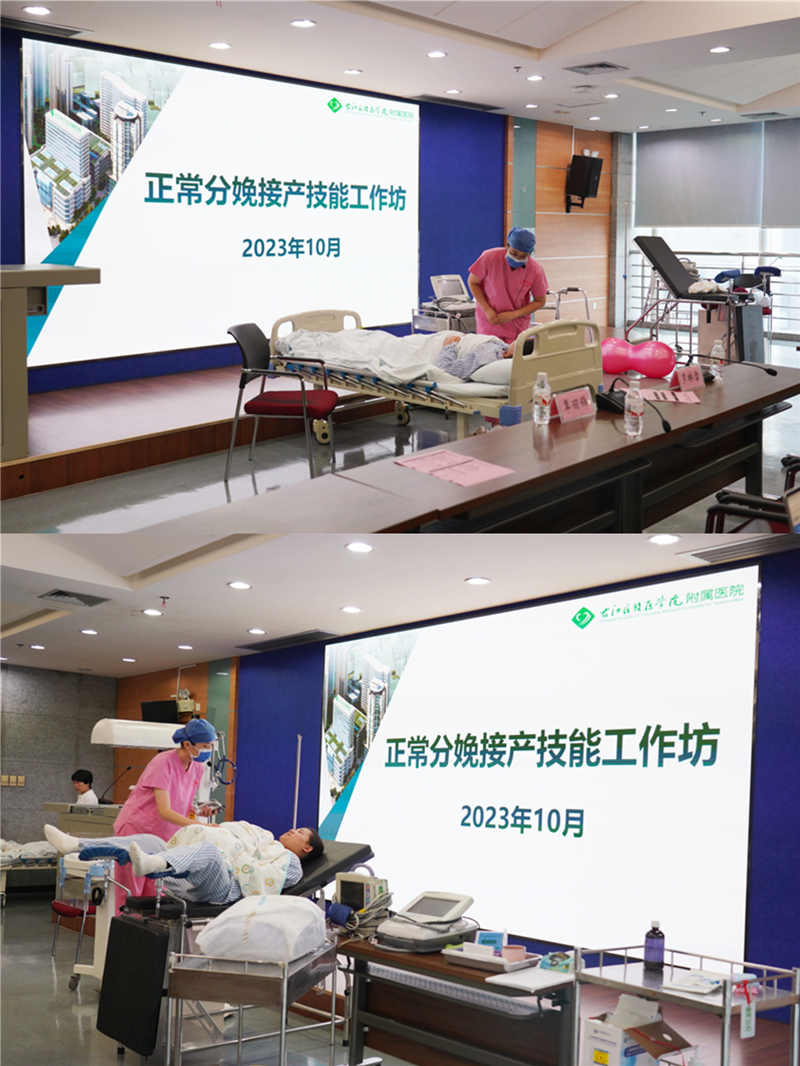 右医附院总院区产科护士长陈丽芬、百东院区妇产科护士长朱小英在现场演示正常分娩接产技能指导。