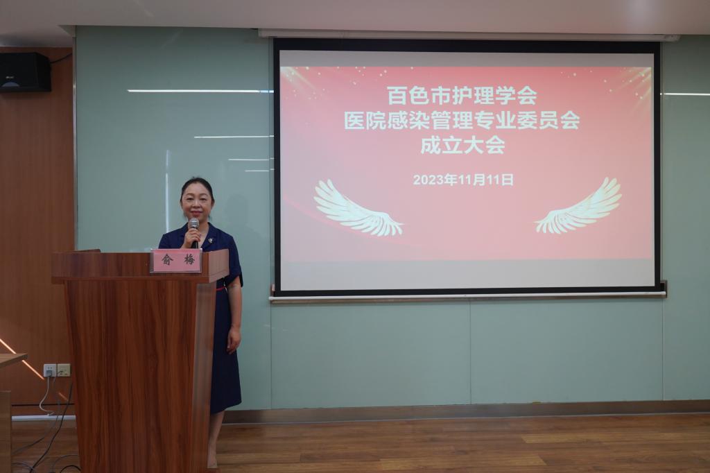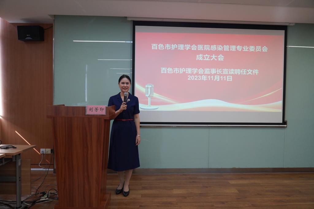 会上,刘芳印监事长宣读了百色市护理学会第一届理事会医院感染管理专业委员会聘任文件,右医附院护理部质控员覃花桃副主任护师担任医院感染管理专业委员会主任委员,百色市人民医院感染性疾病科一病区护士长唐柳英、百色市妇幼保健院手术室护士长吴凤宇、平果市人民医院神经外科护士长黄冰妮担任副主任委员,YABO鸭脖官网附属医院感染性疾病科一病区护士长覃凤飞担任委员会秘书。