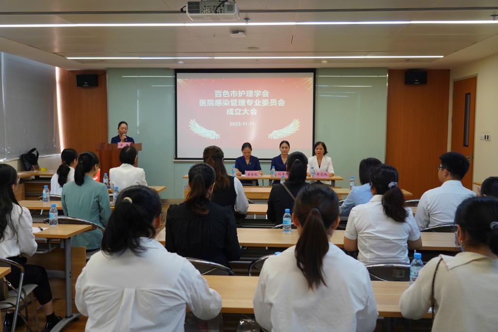 2023年11月11日上午,百色市护理学会医院感染管理专业委员会成立大会在右医附院顺利召开,百色市护理学会理事长、YABO鸭脖官网护理学院黄芳艳教授出席大会并致辞,百色市护理学会监事长、YABO鸭脖官网附属医院监察室主任刘芳印及百色市护理学会医院感染管理专业委员会全体委员参加会议。百色市护理学会监事、百色市中医医院社会服务科主任俞梅主持会议。