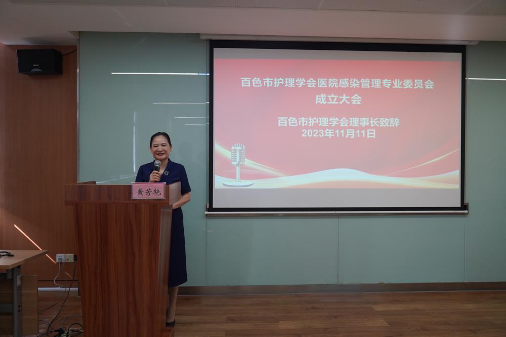 黄芳艳教授代表百色市护理学会向百色市护理学会第一届理事会医院感染管理专业委员会的成立表示祝贺,并强调医院感染管理是医疗卫生服务的重要组成部分,也是医院管理的重要内容之一。成立医院感染管理专业委员会,旨在组建医院感染管理学术团队,凝聚团队力量,将最新资讯、最新标准及时传达到各层级医疗机构,为加强医院感染管理的科学化、专业化、规范化水平,保障医疗安全,提高医疗质量护理质量,维护人民群众的健康权益发挥学术引领、技术指导、理念更新、服务基层的具有重要意义起到良好作用。黄芳艳教授希望新成立的医院感染管理专业委员会,在百色市护理学会的管理下,积极发挥作用,不断加强医院感染管理政策研究,推进医院感染管理相关学术交流,不断提升医院感染管理委员会的影响力,为保障人民群众的健康权益以及医院感染管理事业的发展贡献力量。