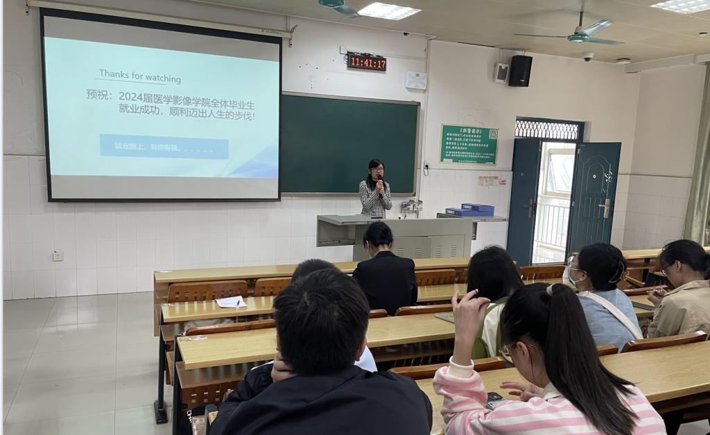会上,黄德尤主任从未来工作岗位和职业的分析、住院医师规范化培训、继续深造学习等三个方面,就医学影像学专业未来的就业方向以及当前的就业形势进行深入分析。他鼓励同学们尽早确定职业目标、完成职业生涯规划以积极应对就业季的压力和挑战。李保生主任就当前毕业生的就业形势、就业意愿以及就业困难三个方面内容进行系统分析,并鼓励同学们应该做到“先就业再择业”、把握好一切机会积极就业。
