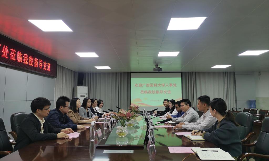 12月11日上午,广西医科大学人事处徐榕副处长一行6人到访鸭脖,就人事工作进行调研。鸭脖人事处相关业务科室负责人参与调研座谈会。