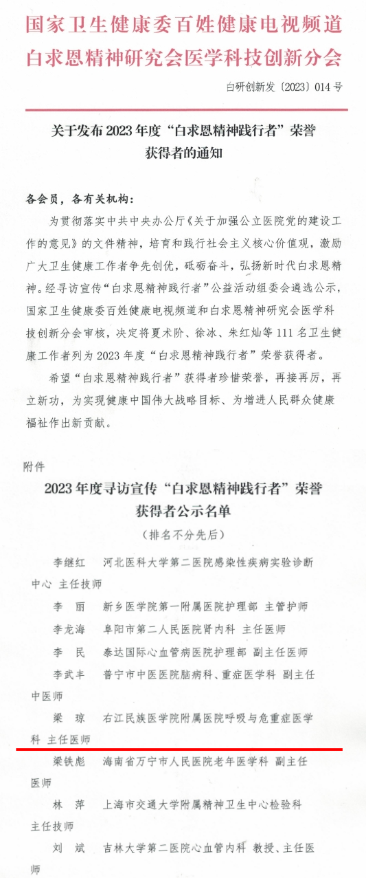 近日,国家卫生健康委百姓健康电视频道和白求恩精神研究会医学科技创新分会下发《关于发布2023年度“白求恩精神践行者”荣誉获得者的通知》,在全国范围内授予111名卫生健康工作者2023年度“白求恩精神践行者”荣誉获得者。右医附院百东院区呼吸与危重症医学科主任梁琼博士获此殊荣。