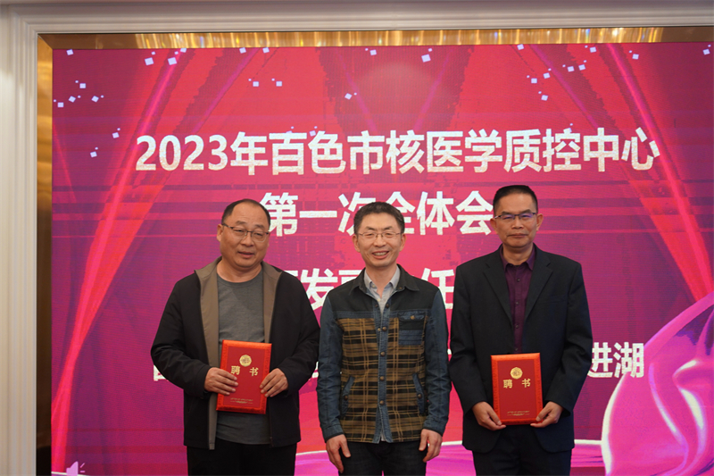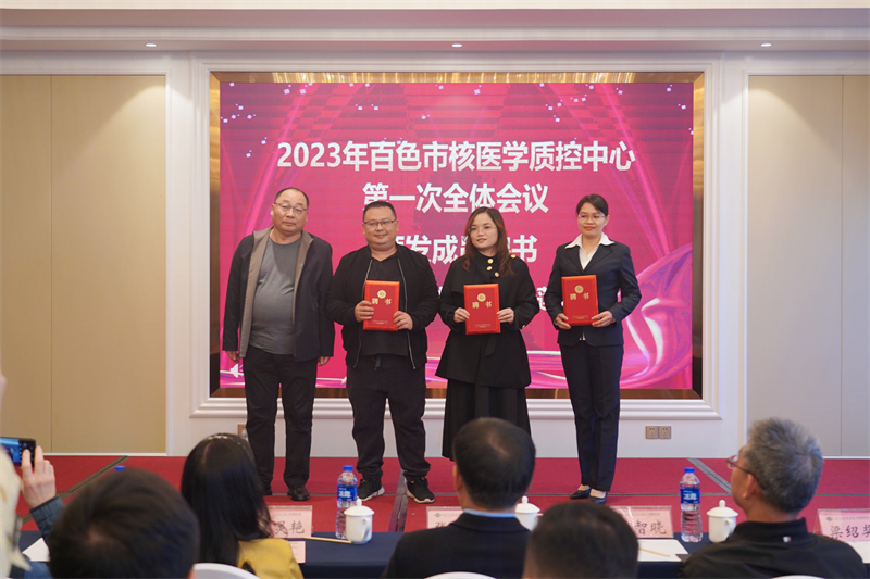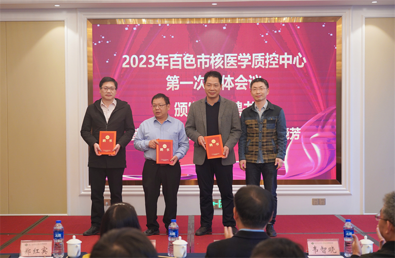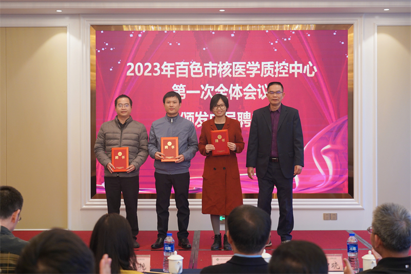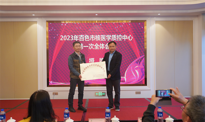 其后,百色市卫生健康委员会副主任、市中医药管理局局长张军将“百色市核医学诊疗质量控制中心”牌匾授予百色市核医学质量控制中心主任郑红宾博士;广西医科大学第一附属医院核医学科主任、广西核医学质量控制中心主任韦智晓教授为郑红宾博士和百色市核医学质量控制中心第一届委员会委员颁发聘任证书。