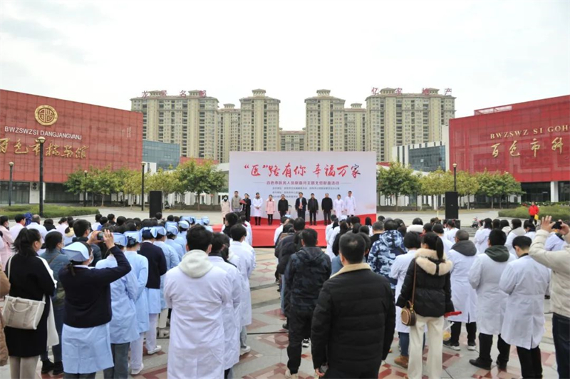 为传递医护人员无私奉献精神,带动更多群众和爱心人士积极参与到无偿献血队伍中来,维护公民健康权益,确保在高校放假及寒冬季节期间,有足够的血液及时救治、快速救援、精准保障,最大限度为人民群众提供坚实医疗服务保障,2023年12月20日—22日,我院与百色市中心血站联合开展首届“医路有你 幸福万家”医务人员献血月无偿献血活动。20日上午,活动启动仪式在百色市图书馆北门广场举行。百色市卫生健康委员会、YABO鸭脖官网附属医院、右江区卫生健康局及城区内各医疗机构的主要负责人及代表200余人参加启动仪式。活动仪式由百色市公民献血委员会办公室副主任、百色市中心血站党支部书记、站长梁朦尹主持。
