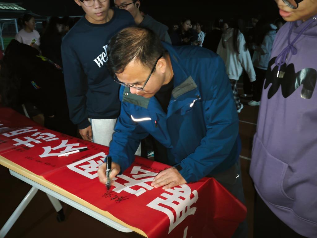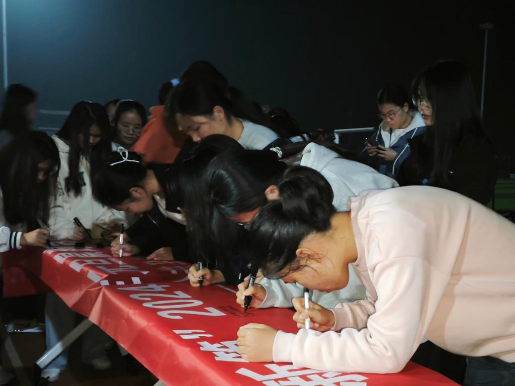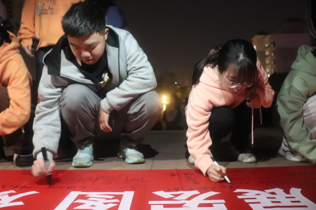 同学们在横幅上写下新年寄语