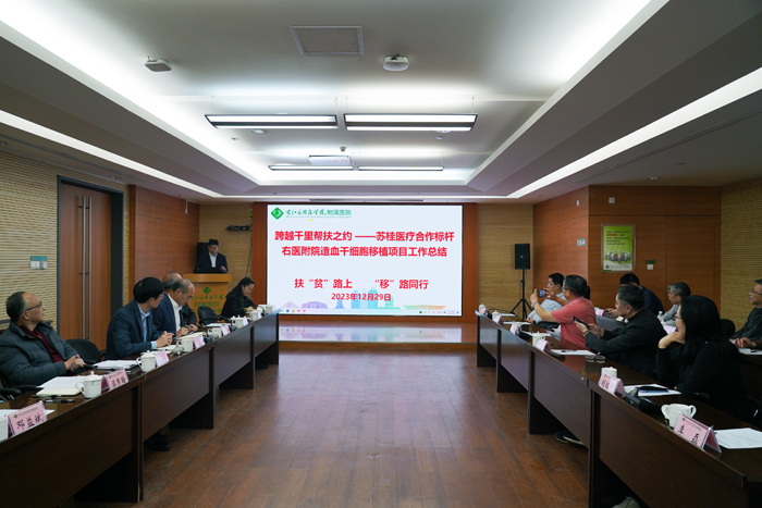 会上,临床医学院(附属医院)副院长蓝常贡就医院造血干细胞移植病区投入使用以来的工作亮点、发展成果和下一步移植病区工作计划等作了详细总结汇报。蓝常贡副院长指出,自2021年5月苏州大学与百色市人民政府、YABO鸭脖官网三方签订合作框架协议以来,在广西壮族自治区党委常委、自治区人民政府常务副主席蔡丽新的关怀指导下,经过两省(区)相关方的共同努力推进,YABO鸭脖官网附属医院顺利引进苏州大学附属儿童医院胡绍燕教授专家团队专项指导医院,于2021年底成功开展重型地贫骨髓移植技术,经过两年多的攻坚克难和团队协作,成果丰硕,截至2023年12月,YABO鸭脖官网附属医院地贫移植项目共完成43例地贫移植手术并顺利出院,该项目取得了显著成效和巨大社会效益。右医附院造血干细胞移植项目作为桂西地区首个造血干细胞移植病区,有效提高了桂西地区地贫患者生存质量,大大提升了本区域地贫防控、救治和科研等方面的能力和水平,下一步,右医附院将积极联合苏州大学附属儿童医院开展更深领域合作,努力将医院的造血干细胞移植技术治疗恶性血液病领域驶入发展快车道。
