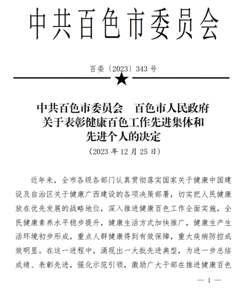 近日,百色市委、市人民政府联合印发《关于表彰健康百色工作先进集体和先进个人的决定》,近年来,全市各级各部门认真贯彻落实国家关于健康中国建设及自治区关于健康广西建设的各项决策部署,切实把人民健康放在优先发展的战略地位,深入推进健康百色工作全面实施,全民健康素养水平稳步提升,健康生活方式加快推广,健康生产生活环境初步形成,重点人群健康得到有效保障,重大疾病防控成效明显。在这一进程中,涌现出一大批先进典型。为进一步总结成绩、表彰先进,强化示范引领,激励广大干部在推进健康百色工作中作出新的更大贡献,市委、市人民政府决定,对2020年以来在健康百色工作中成绩显著、表现突出的集体和个人予以表彰。