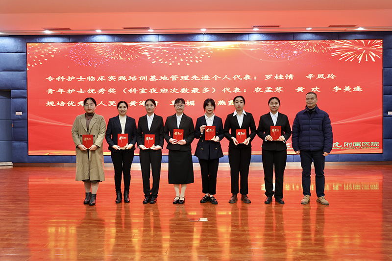 临床医学院(附属医院)韦忠恒院长最后在总结讲话中强调,全院护理人员在2023年不分昼夜、不辞劳苦,始终以饱满的状态,在平凡的岗位上继承和发扬南丁格尔“不畏艰险、甘于奉献、救死扶伤、勇于献身”的人道主义精神,践行着“根植老区为人民,医者患者一家人”理念,医院护理事业在护理质量、服务态度、专业技能等各方面都取得了长足进步,赢得了同行和社会的广泛赞誉。韦忠恒院长表示,医院目前正处于“一院两区”高质量发展的起步阶段,也是规模扩张与质量提升并存的关键时期,希望全院护理工作者首先要提高政治站位,树立忧患意识,结合2024年任务目标,围绕学校第八次党代会的会议精神,进一步加强护理专科的建设,打造桂西一流、省内有重要影响力的“医教研协同发展型”学科。其次要继续探索“一院两区”同质化管理模式,创建科室品牌、医院品牌,稳步推进“互联网+护理服务”工作,深入推进优质护理服务 ,提高患者满意度,提高医院的社会效益。最后要重视DRG付费改革工作,积极响应国家政策,高质量推进三级医院等级复审工作,加快迈出“六位一体”协同发展的“一院多区”医疗集团新征程的步伐,为实现医院“一院多区”跨越式发展以及学校早日建成区域性高水平医科大学而努力奋斗。