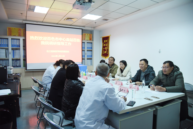 为进一步保障临床用血需求安全、充足,2024年1月25日下午,百色市中心血站站长梁朦尹一行4人到右医附院总院区输血科进行调研指导并召开座谈会。右医附院副院长邓益斌出席会议,相关部门负责人参加会议,右医附院医务部副部长林娜主持会议。