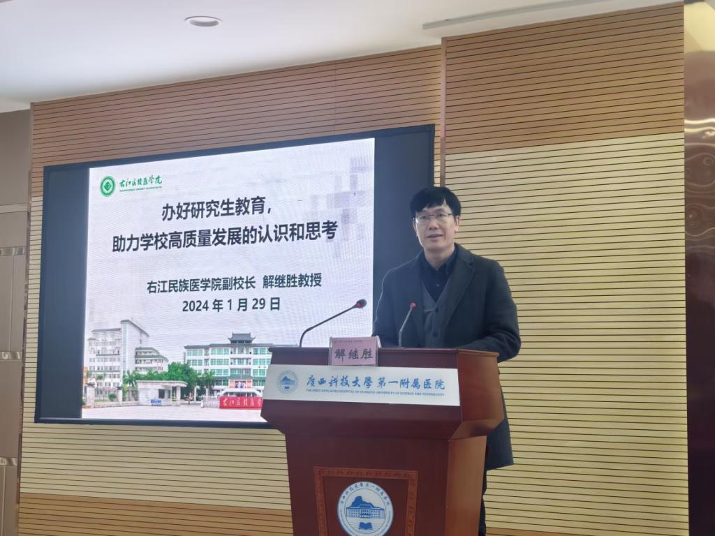 揭牌仪式之后,解继胜副校长作了题为《办好研究生教育,助力学校高质量发展的认识和思考》的专题讲座,结合研究生教育新形势新使命、新变化新机遇、学科建设方向性,介绍了鸭脖学科建设及学位授权点建设情况与学校发展状况。