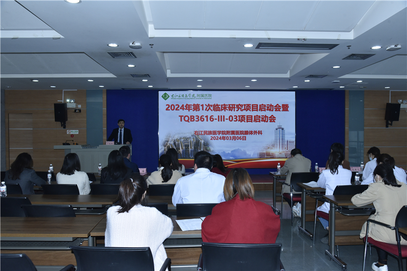 为整体提高临床科研水平,以点带面增强全院学科建设能力,全面规范开展药物临床试验,3月6日上午,临床医学院(附属医院)腺体外科在总院区外科综合大楼5楼大教室召开2024年首次临床研究项目暨TQB3616-III-03项目启动会。临床医学院(附属医院)党委书记林栩、院长韦忠恒出席会议并致辞,副院长潘征主持会议。临床医学院(附属医院)药学部周岐骥副主任(主持全面工作)、医院药物临床试验机构办公室主任何思陆,正大天晴药业集团股份有限公司注册临床运营部经理何学之等相关科室医护人员和药业研究人员参加会议,共同讨论研究相关注意事项、专题培训等。