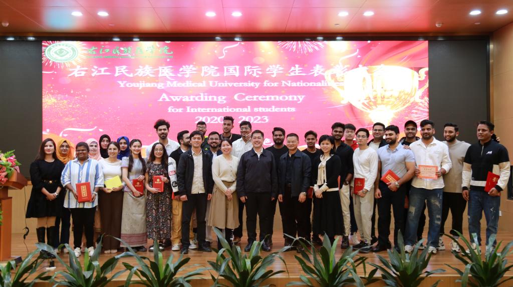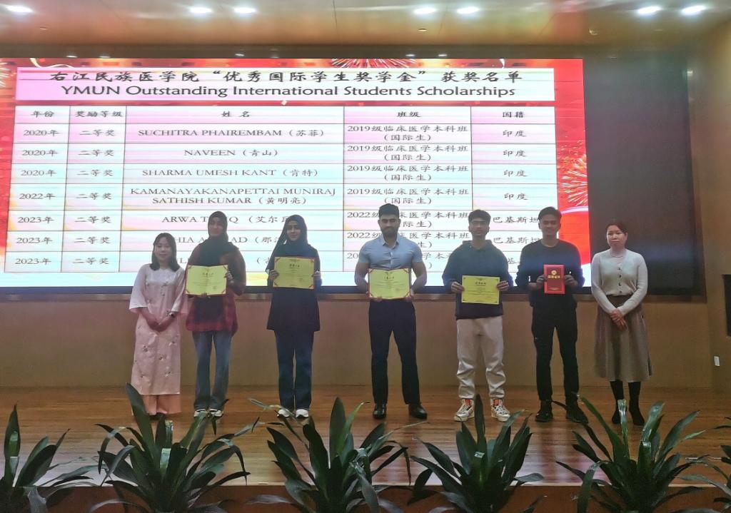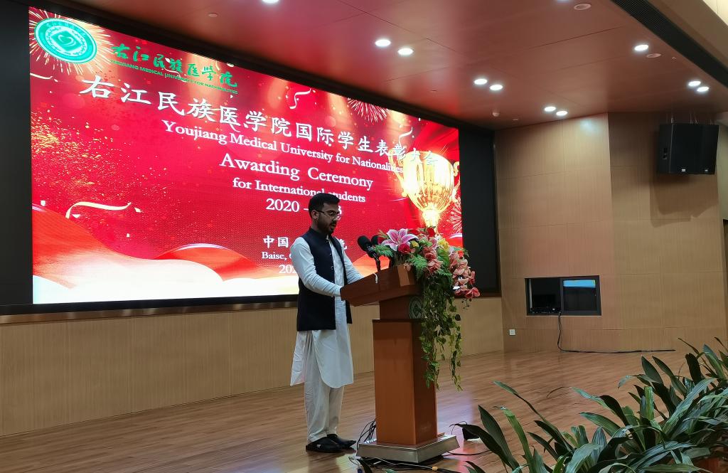 2022级临床医学本科班获奖的国际学生代表Abubakar Khan(艾布卡)在发言中表示,在疫情期间无论是医学专业的教师还是管理人员,都给予了他极大的帮助和支持。他还表示在右医的学习经历超出了预期,学校有着先进的教学设施和优秀的教学方法,走在医疗和教育发展的前沿,将最新技术融入医学教育,彻底改变了教学和学习体验。今后他们将珍惜荣誉,继续努力,为学校争光,为中外友谊贡献力量。